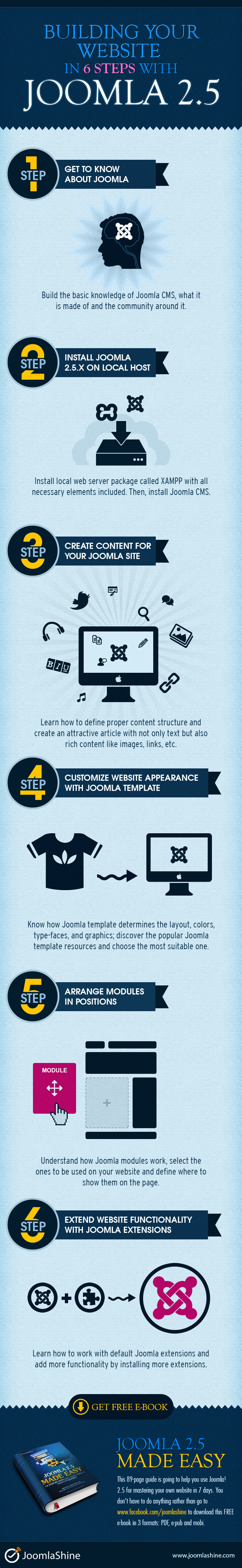 Una infografía que dice: Crea un web en 6 pasos con Joomla 2.5.