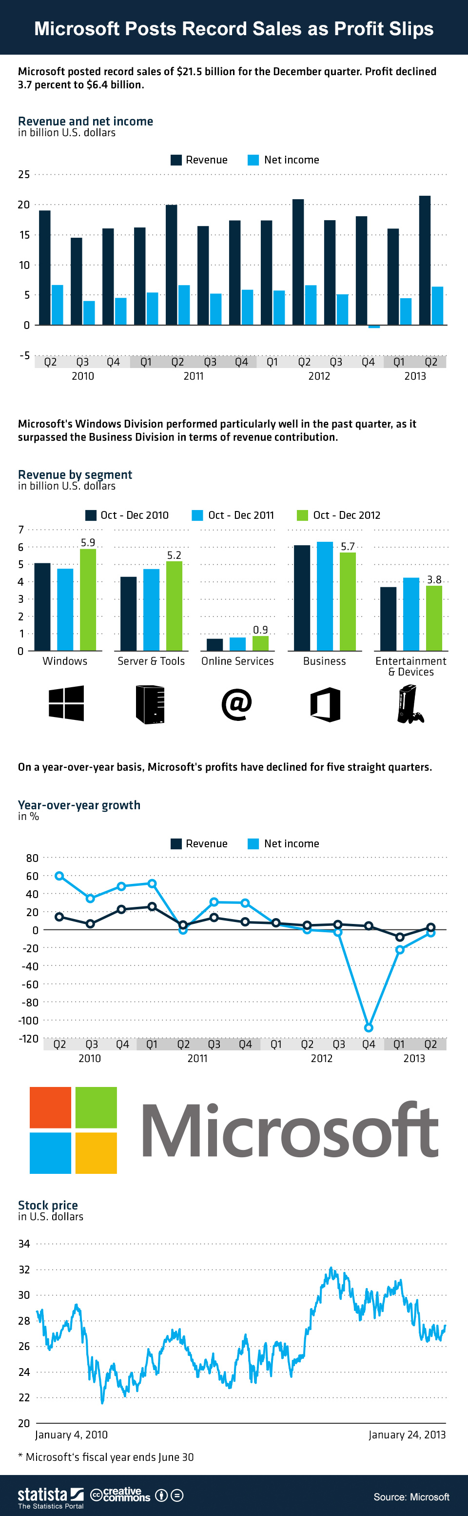 Una infografía sobre las ventas e ingresos netos de Microsoft 2010-2012.
