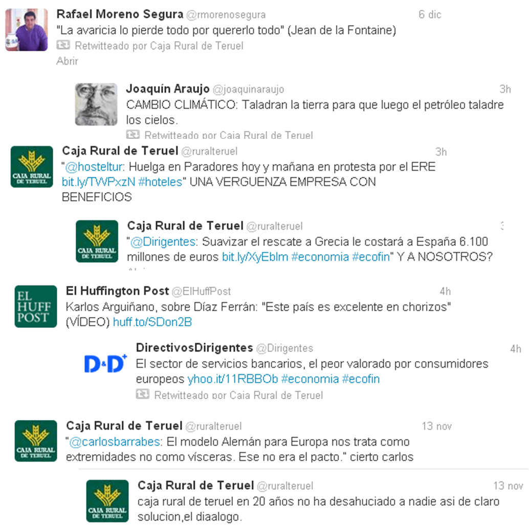 Hace un tiempo escribí un artículo sobre la manera extraña en la que la Caja Rural de Teruel gestionaba su cuenta de Twitter (@ruralteruel), es uno de esos artículos que uno escribe sobre mala gestión de la reputación online, o cómo no gestionar una crisis online y que luego se utilizan en la formación sobre Social Media y Marketing, el artículo lo ilustraba con una recopilación de algunos tuits y retuits de dicha cuenta: