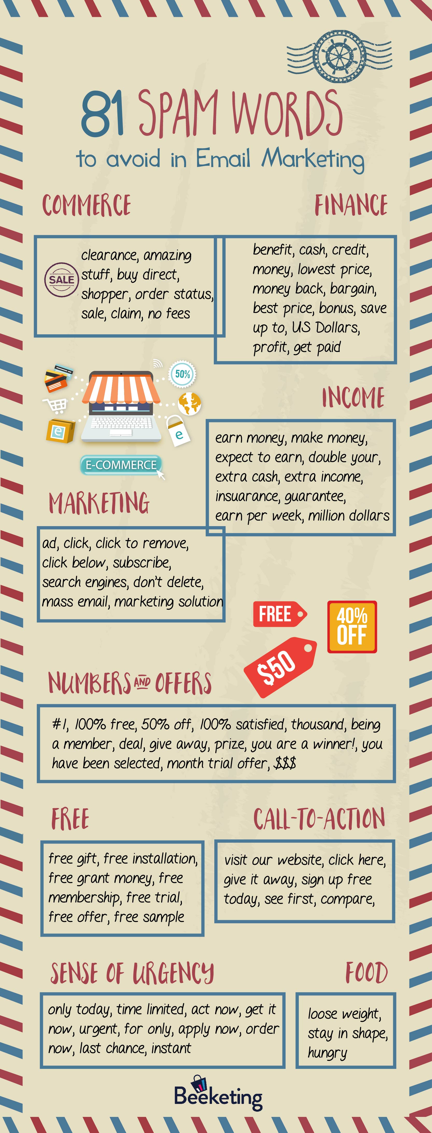 Una infografía con 81 palabras spam que se deben evitar en email marketing. Vía Beeketing